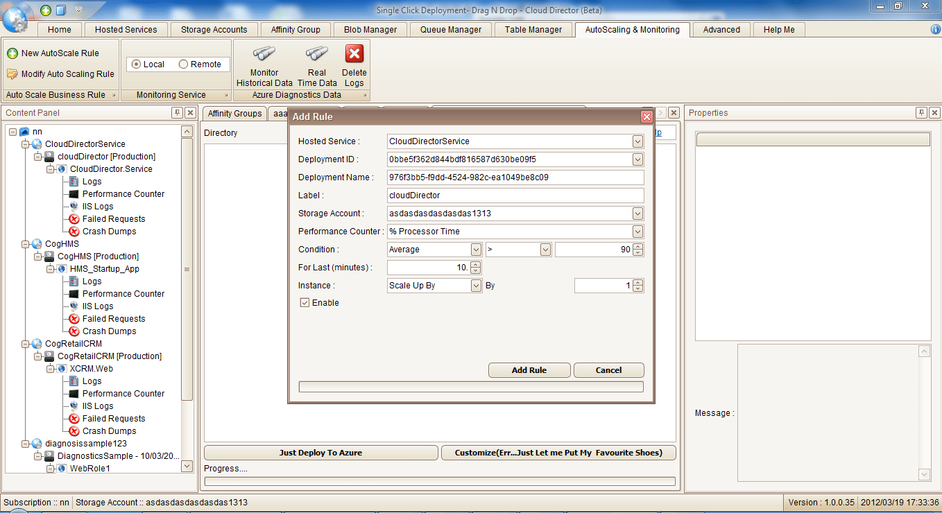 AA) Single click Drag N Drop Windows Azure Deployment: You don’t need to know anything about Azure. If you have a working .Net(or many other technology stacks including php, Tomcat, Jboss, Scala, Play, Lift etc) working solutions, Cloud Director can deploy it in single click.