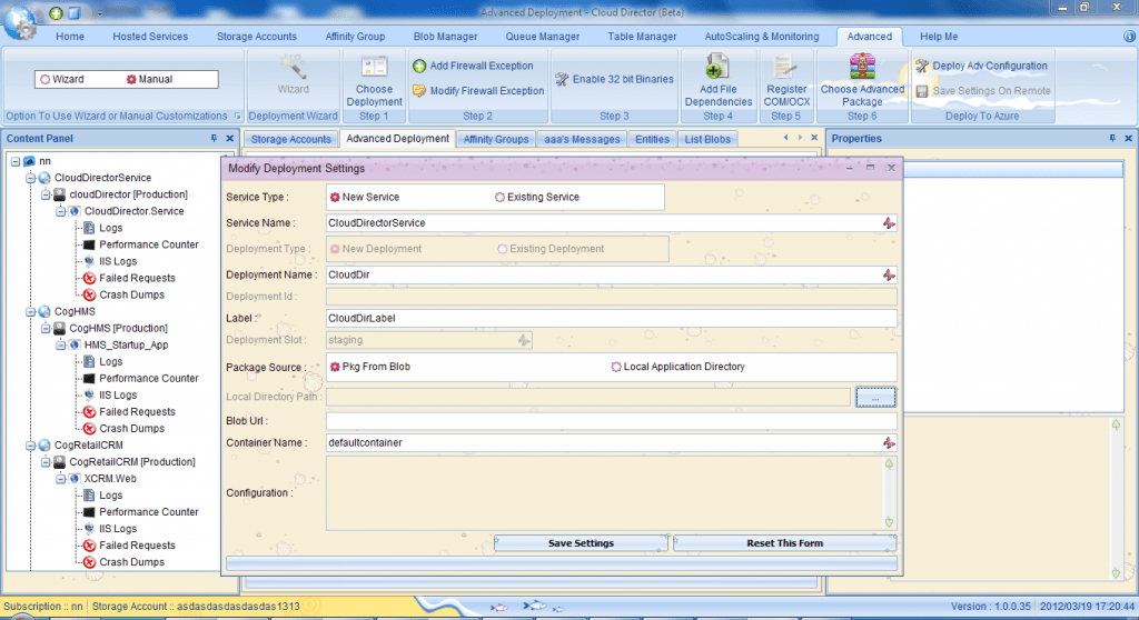Azure Cloud Director brings revolutionary Single Click Windows Azure Deployment using simple Drop-Deploy-Deploy Functionality . Just Drag your application both .Net Application or Non-.Net application(ASP.net,Classic ASP,PHP,silverlight,TomCat,Jboss,Glassfish) application root folder and our Windows Azure Cloud Manager shall deploy to your azure subscription using default settings which you do not need to bother about if you are new to azure.